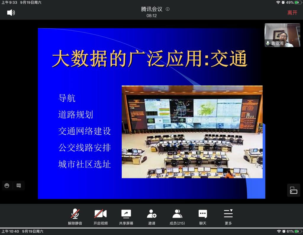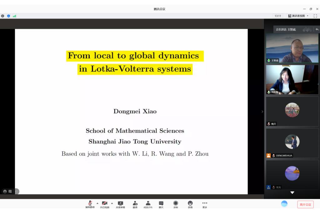 论坛邀请院士、杰出青年基金获得者共10位数学领域的资深专家作线上特邀报告。中国数学会理事长、中国科学院院士、北京大学田刚教授作了题为“欧拉数与几何”的邀请报告;国际工业与应用数学联合会主席、中国科学院院士、中国科学院数学与系统科学研究院袁亚湘教授作了题为“大数据与优化方法”的邀请报告;中国科学院院士、中国科学院数学与系统科学研究院周向宇研究员作了题为“从复数谈起”的邀请报告;中国科学院院士、中国科学技术大学叶向东教授作了题为“The parallels between topological dynamics and ergodic theory”的邀请报告;欧洲科学院外籍院士、中国科学院自动化研究所脑网络组研究中心主任蒋田仔研究员作了题为“以数学为基础的脑网络组学及其对类脑智能的启示”的邀请报告;国家杰出青年基金获得者、广州大学庾建设教授作了题为“登革热等蚊媒传染疾病的防控与数学建模”的邀请报告;哥伦比亚大学傅氏基金会应用数学讲席教授杜强教授作了题为“Nonlocal modeling, analysis and computation: some recent development”的邀请报告;北京科学计算研究中心应用与计算数学研究部主任张智民教授作了题为“H(curl curl)-conforming and H(grad curl)-conforming finite elements-beyond Nedelec”的邀请报告;国家杰出青年基金获得者、上海交通大学肖冬梅教授作了题为“From local to global dynamics in Lotka-Volterra systems”的邀请报告;国家杰出青年基金获得者、四川大学张伟年教授作了题为“Restricted independence in displacement function”的邀请报告。
