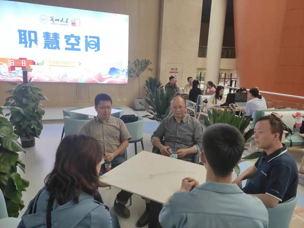 招聘宣讲会开始之前,华力集团一行相关负责人与学生就业指导与服务中心相关负责老师在兰州大学职慧空间咖啡厅进行交流,双方就企业管理模式、招聘工作流程和应届毕业生校招等方面进行了深入交流。